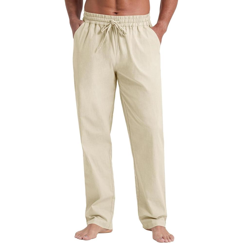 NITAGUT Mens Linen Pants Casual Elastic Waist Drawstring Lightweight Summer Beach Trousers with Pockets(Beige)