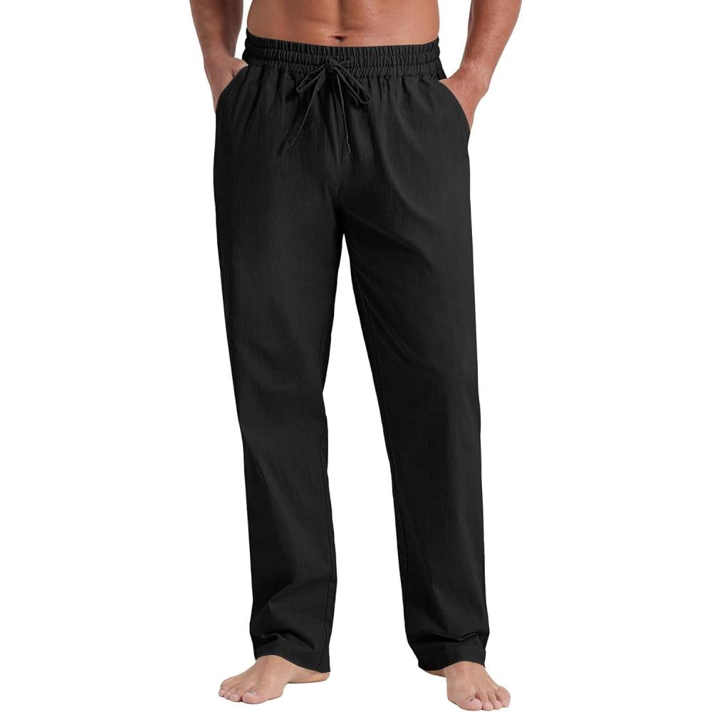 NITAGUT Mens Linen Pants Casual Elastic Waist Drawstring Lightweight Summer Beach Trousers with Pockets(Black)